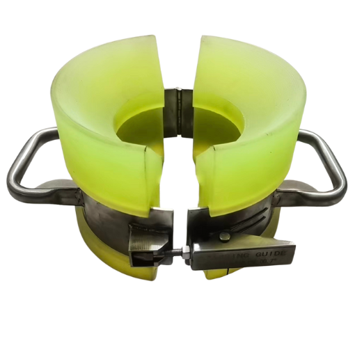 Each guide features a rugged steel frame and replaceable shell inserts that come in two material options — Polyurethane and Nylon — to suit different operational requirements.
